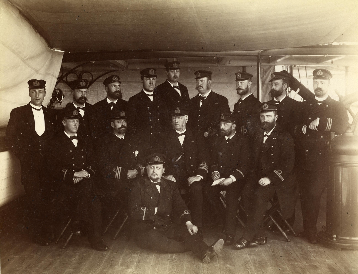 Gruppbild ombord. Stående från vänster: U-löjtn. frih. J.A.von Duben, Löjtn. E.G.D.Maechel, U-löjtn:a J.K.Sundholm, T.H.Kraak, frih. B.A.H.Lagerbjelke, Löjtn:a A.Beén, H.Wrangel, A.W.Wallenberg, Läkare Med.kand. J.W.Thorn.