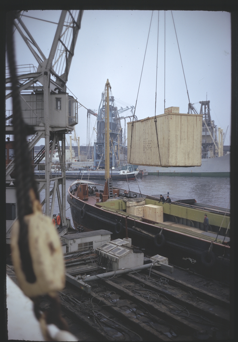 Lastning i Bremerhaven ombord på VISHAMN, med vilket Markefelt 1974 företog resa till Zanzibar.