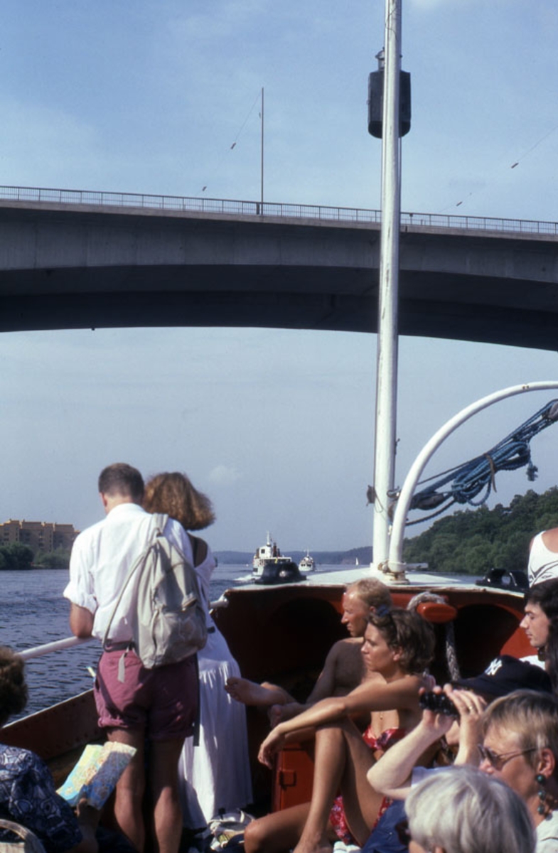 Passagerare på M/S Mariefreds fördäck. I bakgrunden Essingeledsbron.