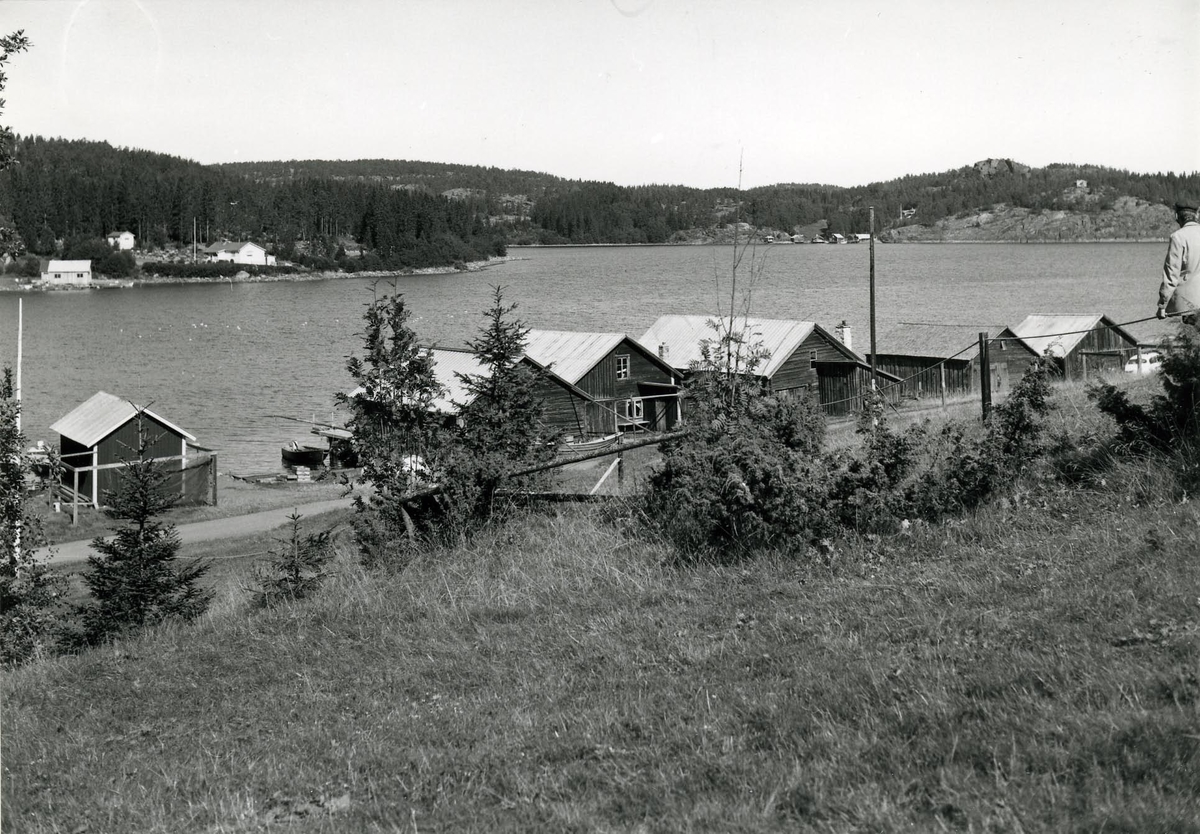 Ångermanland, Nordingrå sn. Sjöbodar i Barsta fiskeläge fotograferade från Kapellbacken. Fisket i Barsta bedrivs nu endast som fritidsfiske. Befolkningen har skaffat sig förvärvsarbete på annat håll.