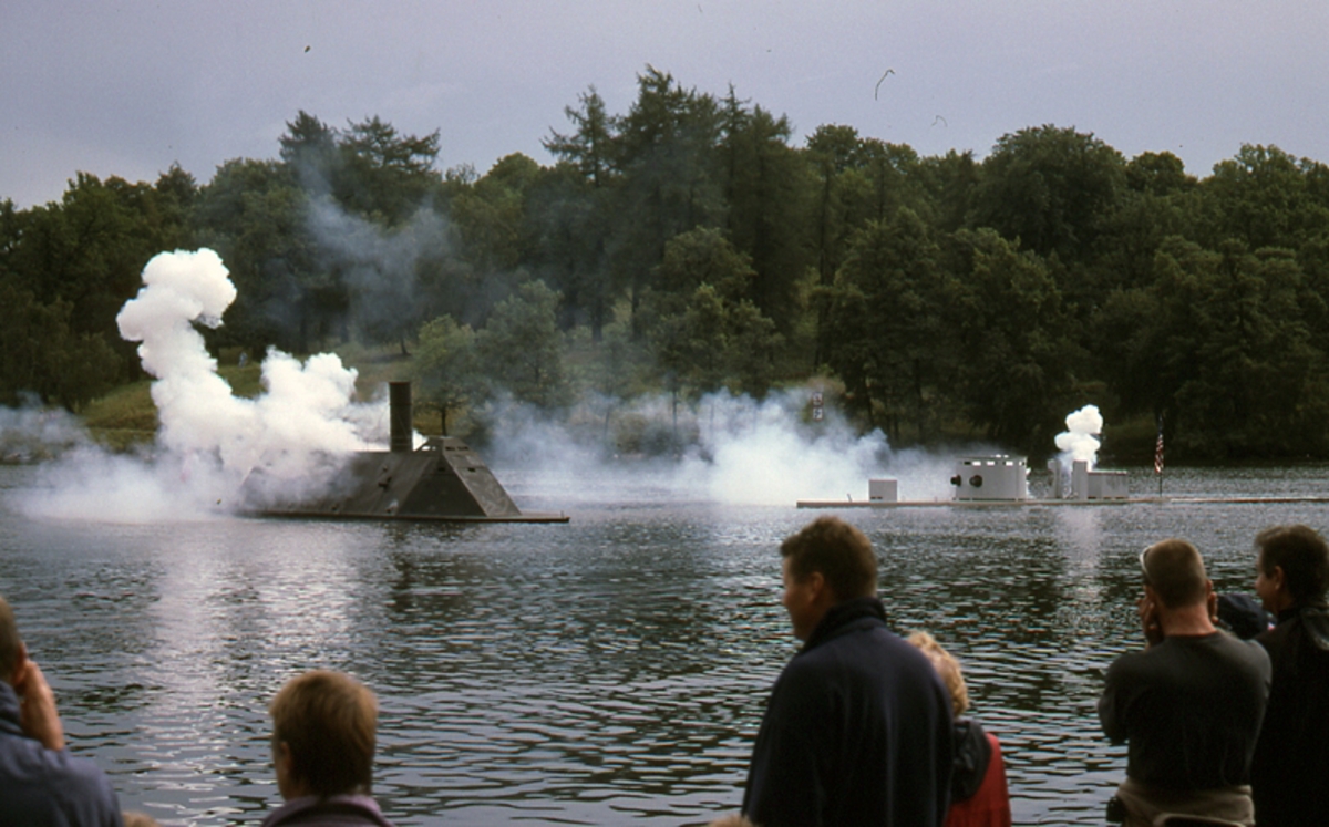 Titel: Rekonstruktion med modellbåtar av sjöstriden mellan nordstaternas Monitor och sydstaternas Virginia (Merrimac) under amerikanska inbördeskriget. På Djurgårdsbrunnskanalen 2003. Foto