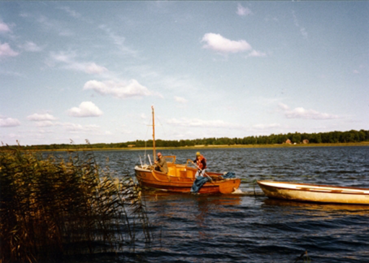 Tillhör rektor Stenström Rosendal, Tosterön [norr om Strängnäs]. I båten Kjell Borneland.