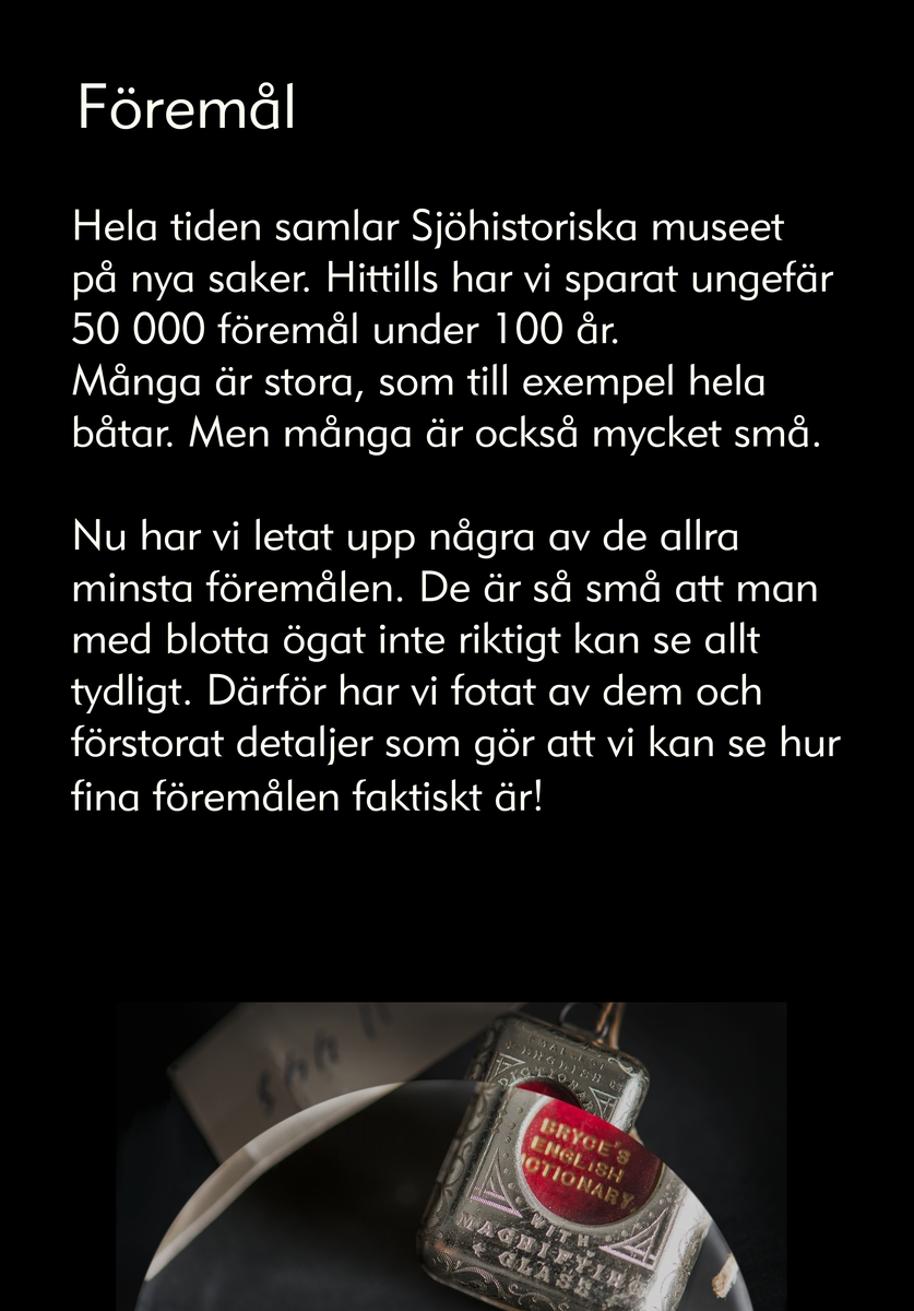 Trappmonterutställning på Sjöhistoriska som visar små föremål ur museets samlingar.