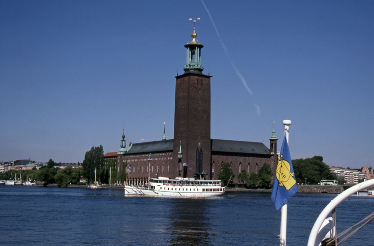 S/S Mariefred på Riddarfjärden, Stockholm. I bakgrunden Stockholms stadshus.