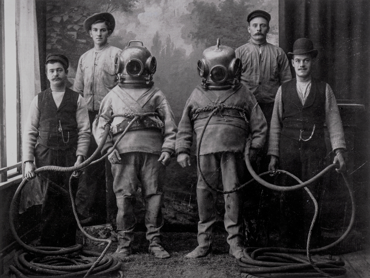 Skånska Cementgjuteriets dykare med hantlangare, fotograferade i ateljé i Vimmerby omkr. 1910