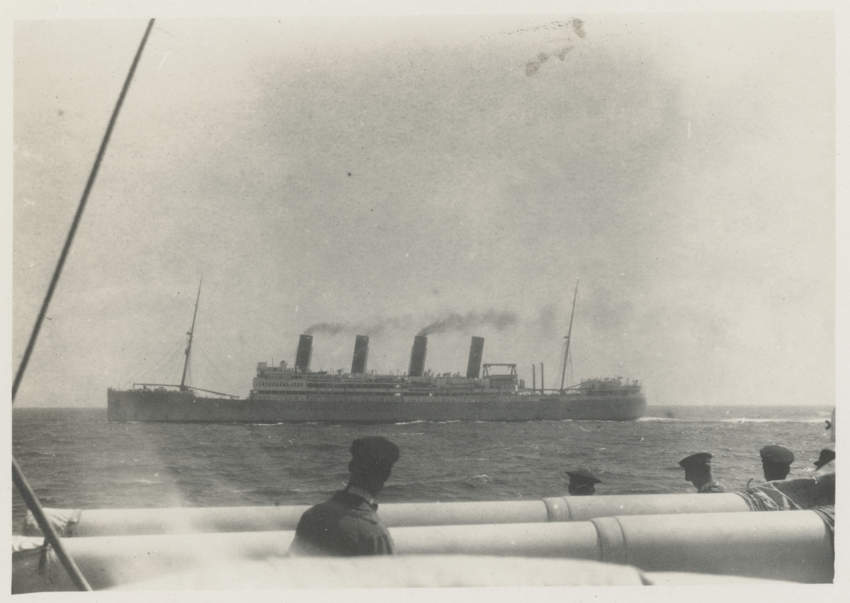 Besättningen på örlogsfartyg, sannolikt pansarskepp, iakttar större passagerarfartyg.