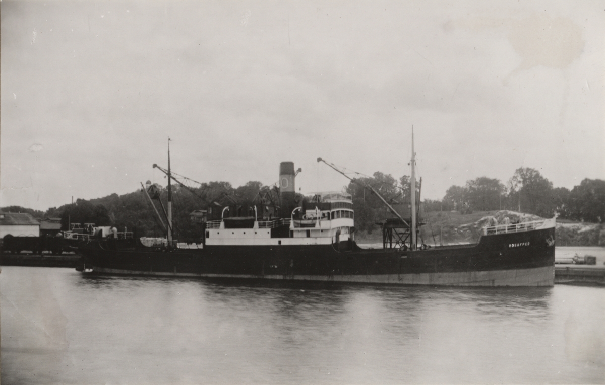 Titel: Lastångfartyget ROSAFRED från Verkebäck. Flygtorpederad utanför holländska kusten den 6 sept. 1944. Besättningen räddad.