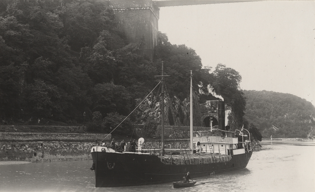 Lastångfartyget STORFORS av Uddeholm passerar under Cliffton Bridge, Bristol kanalen [sic].