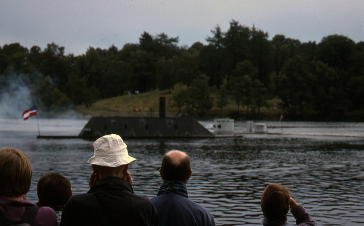 Titel: Rekonstruktion med modellbåtar av sjöstriden mellan nordstaternas Monitor och sydstaternas Virginia (Merrimac) under amerikanska inbördeskriget. På Djurgårdsbrunnskanalen 2003. Foto
