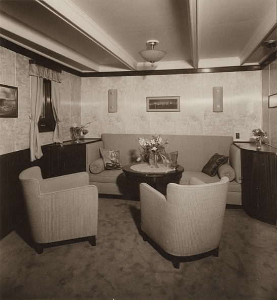 Befälhavarens skrivhytt sedd från babords sida. Väggar av polerad flammig björk i naturfärg, beigefärgade gardiner och möbeltyg, elektrisk armatur av cremefärgat mattslipat glas, matta enfärgad blå och gul.