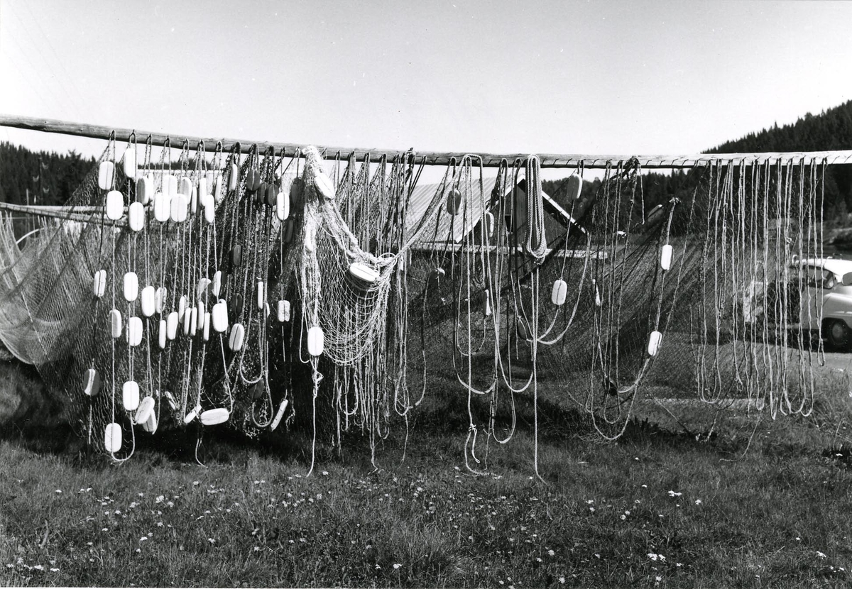 Ångermanland, Nordingrå sn. Storryssja på tork i gistvall. Ryssjan är tillverkad av nylon och har flöten av frigolit-liknande material.
