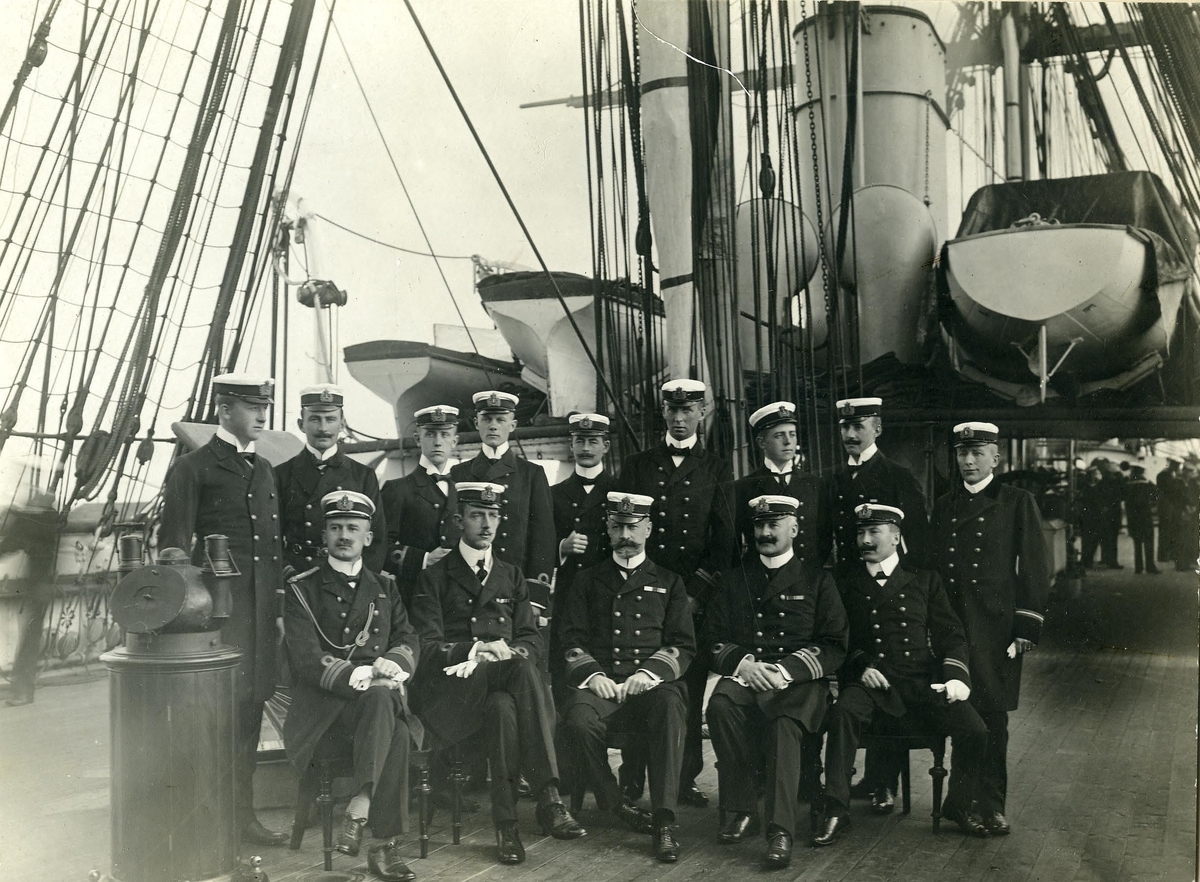 Sittande från vänster: Kapt. C.L.de Champs, U-löjtn. Prins Wilhelm, KK1. A.Ekström, Kapt. R.Liepe, Mar.läkare J.Prag.
