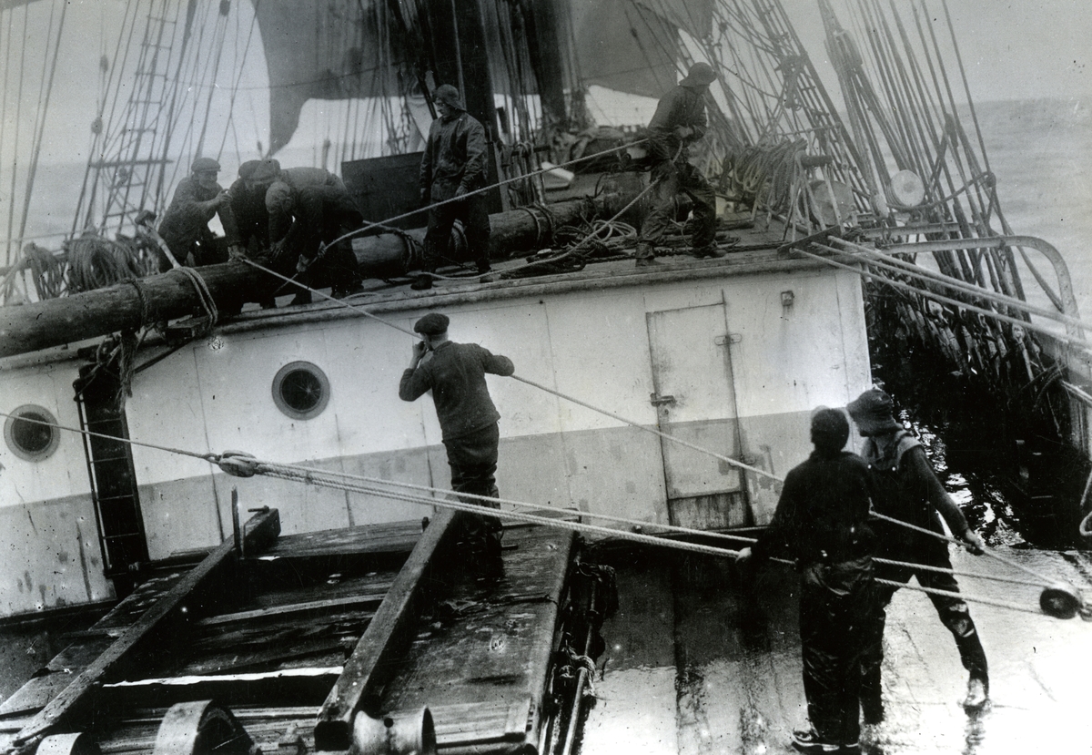Titel: [från fotobeskrivningen:] [---] "Däcksbild. Skarorna efter stormen. Surrning av reservspira, som slagit[s] loss av sjön." [---]
