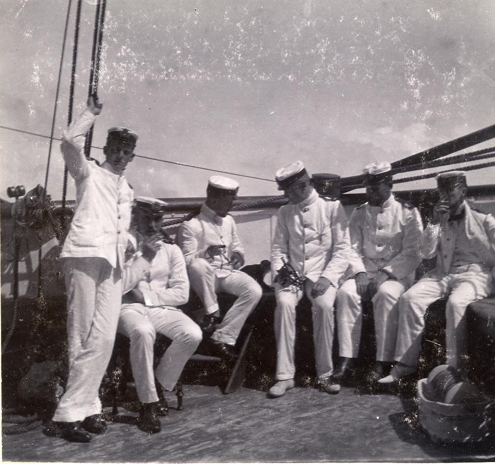 "Middagshöjd". Från vänster: å akterdäck. U-löjtn:a D.H.Tisélius, S.Lindstedt, H.V.Simonsson, S.F.Dehlgren,