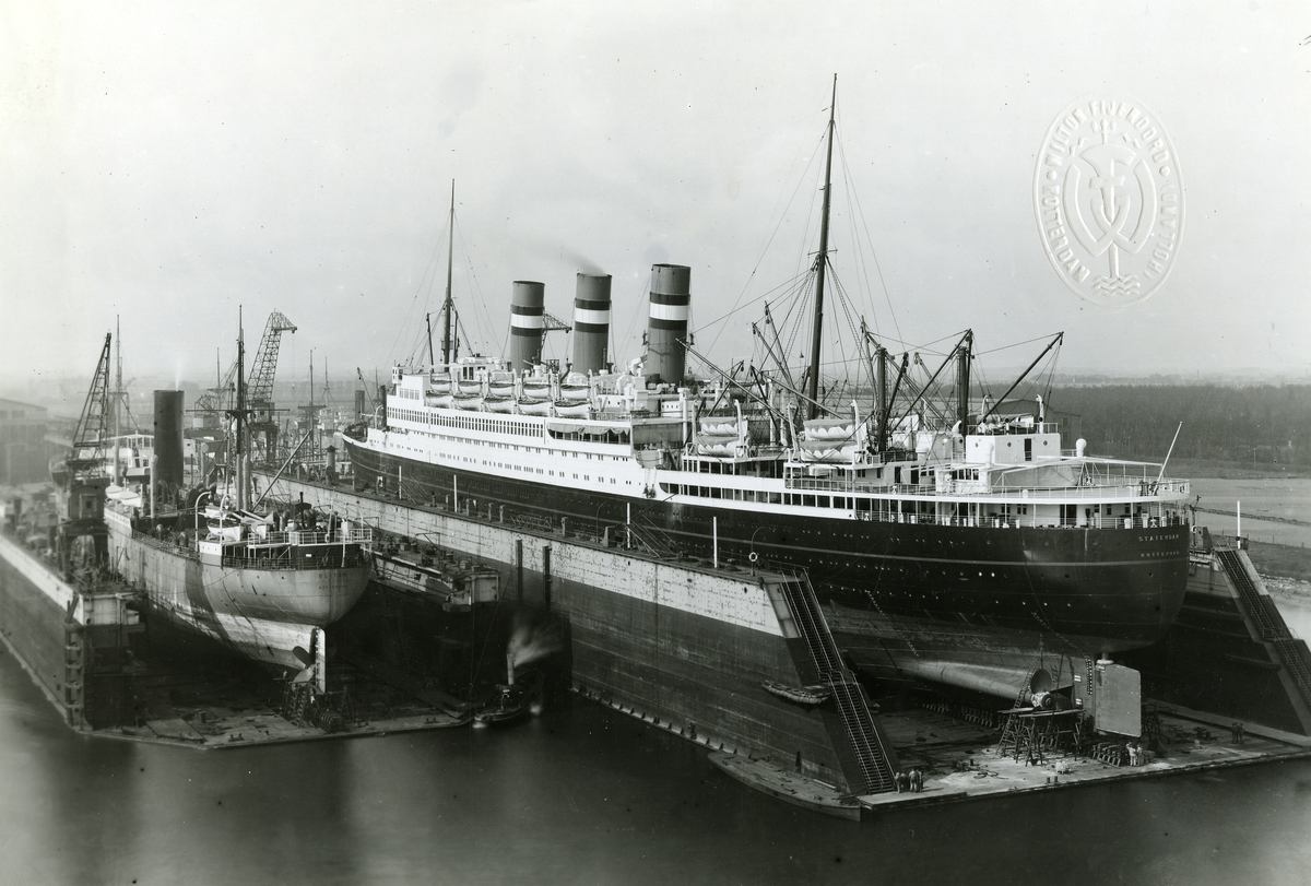 STATENDAM 30.000 tons of the Holland-America Line and SS Blitar 10.300 tons, of the Rotterdam Lloyd in our Docks at Schiedam.