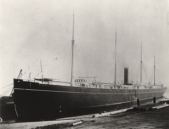 Fot i svartvitt visande lastångfartyget "EL SUD" av New York, i okänd hamn.