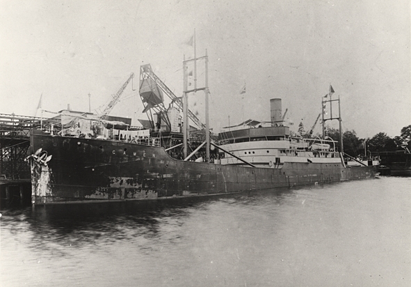 Foto i svartvitt visande lastångfartyget "GAMEN" av Stockholm, i okänd hamn.