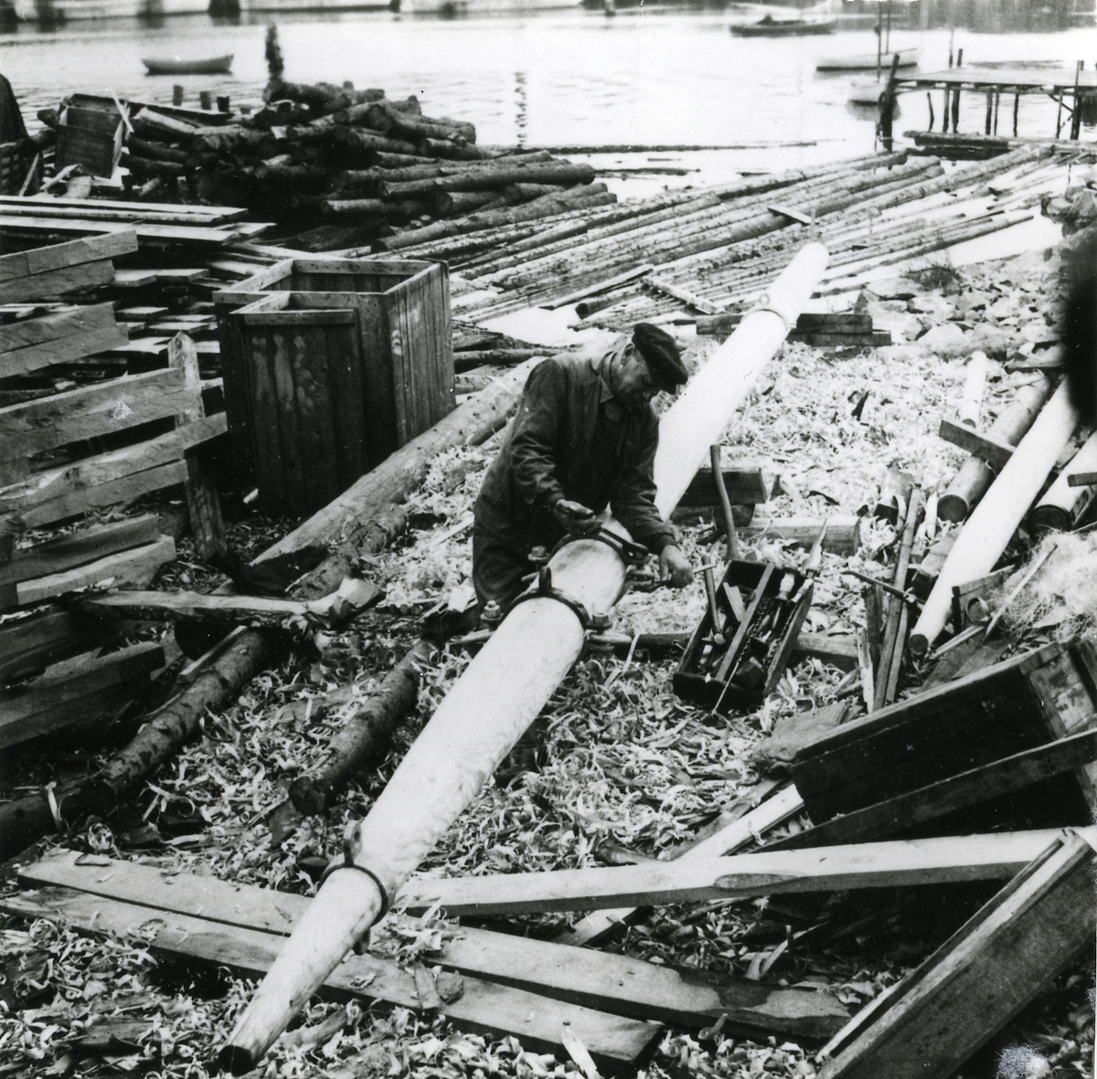 Titel: Refoto av kopior föreställande skeppsbyggnadsarbete på ett trä skeppsvarv på 1930 talet.