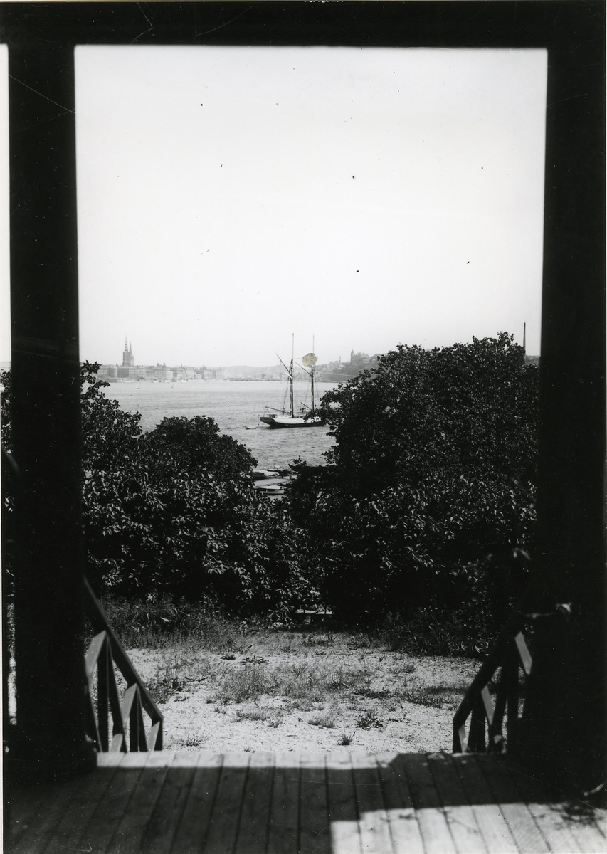 Utsikt från Marieberg över Riddarfjärden med Gamla staden och Söder i bakgrunden, en skonare i förgrunden.