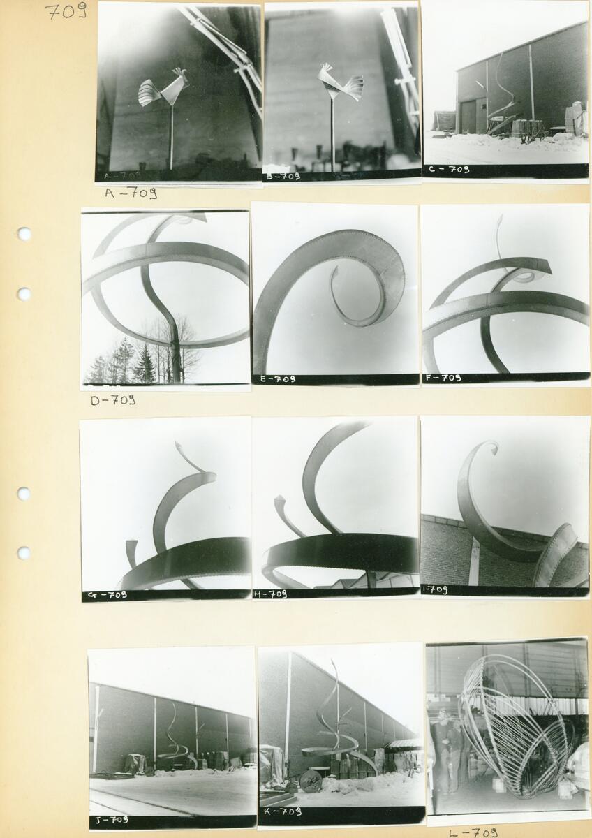 2 bilder av en skulptur, torntupp för Vanörs kyrka, 9 bilder av skulpturen Spiralen, 1 bild av skulpturen Sfär.