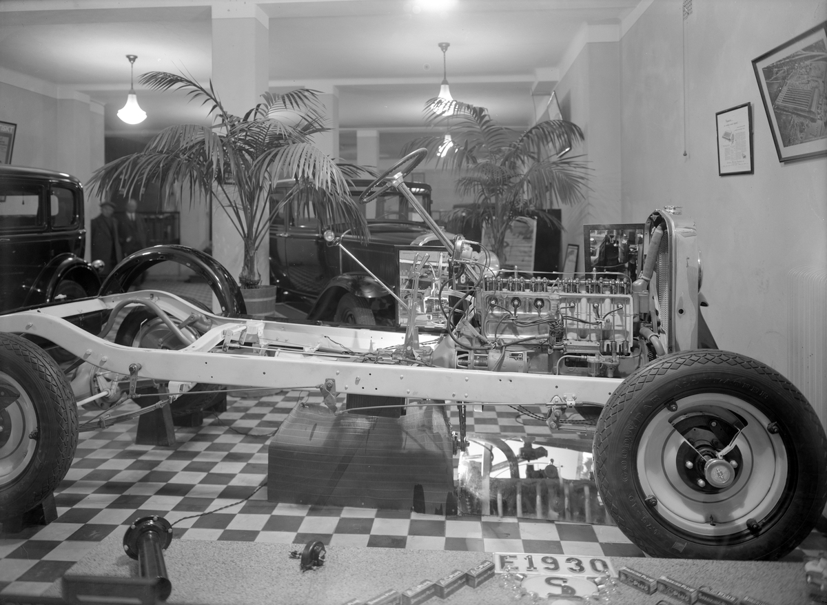 Nya Billaffären i Linköping visar det inre av en Chevrolet med tydlighet. Bilaffären var inrymd i och i anslutning till fastigheten Platensgatan 6. Bilden är daterad år 1931.
