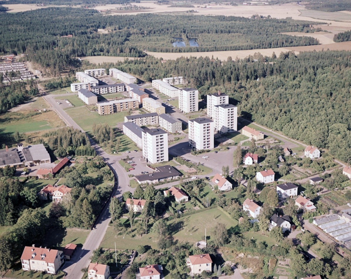 Del av Motala från ovan med blickfång mot flerfamiljshusen utmed Kråkrisvägen.