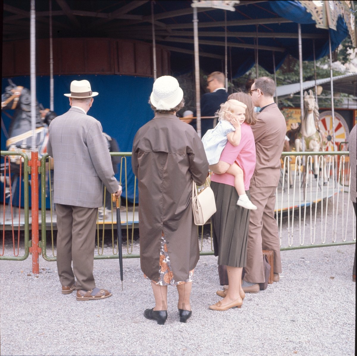En grupp personer betraktar en karusell. Ett barn betraktar något som är mer spänande och som inträffar utanför bilden.