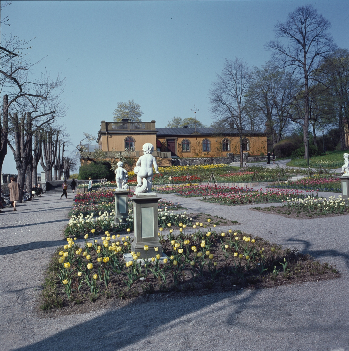 Blommande vårblommor i Rosenträdgårdens välskötta rabatter. I bakgrunden syns Sagaliden och i förgrunden ett par figurer placerade i rabatterna.