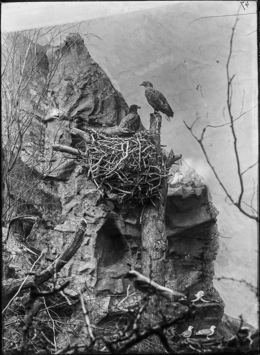 Diorama från Biologiska museets utställning om nordiskt djurliv i havs-, bergs- och skogsmiljö. Fotografi från omkring år 1900.