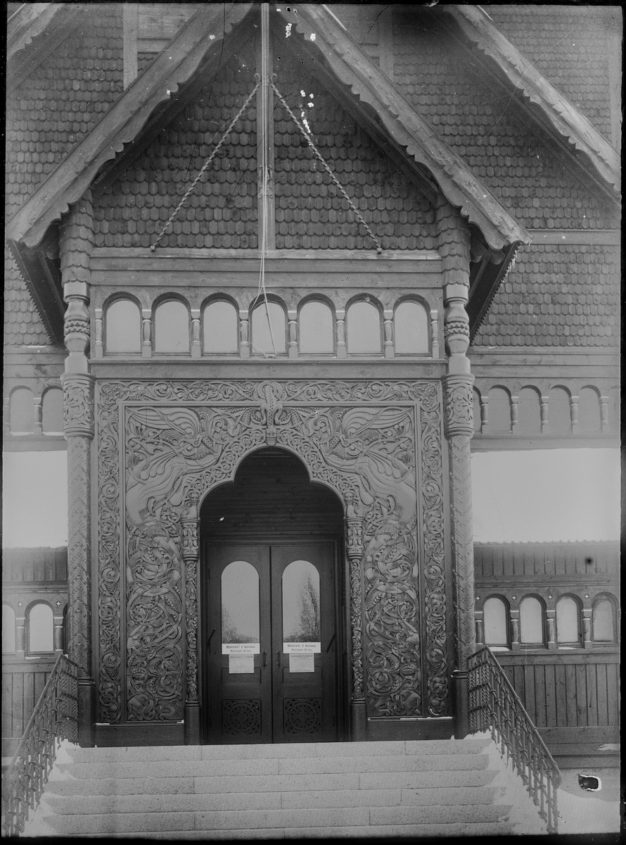 Biologiska museet entré. Arkitekt Agi Lindegren efter förbilder från de norska stavkyrkorna i Borgund, Lom och Urnes. Portalens träsniderier i relief ansluter nära till Borgunds stavkyrka I Sogn og Fjordane. Fotografi från omkring 1900.