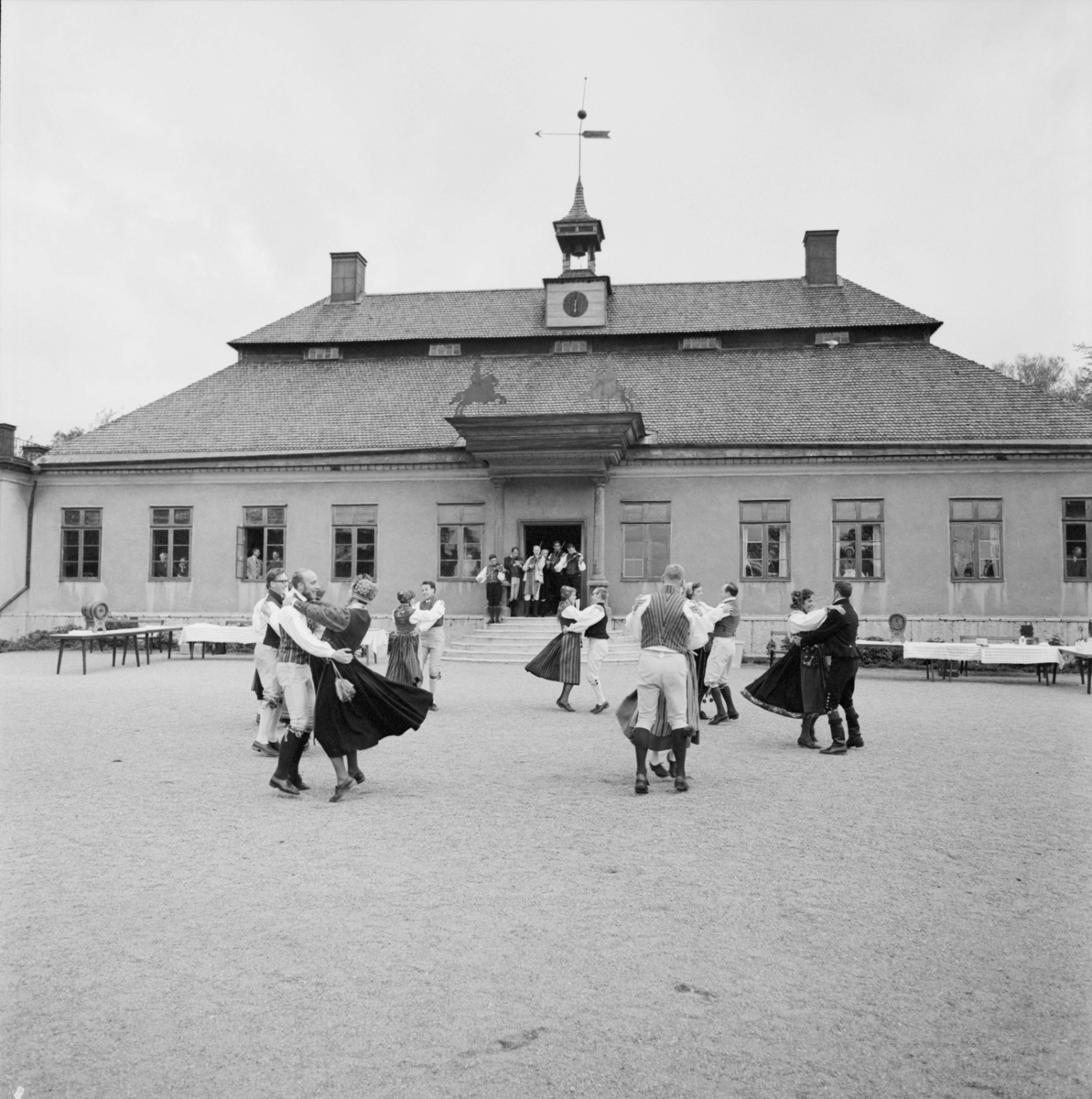 Folkdans på gårdsplanen framför Skogaholms herrgård, Skansen.