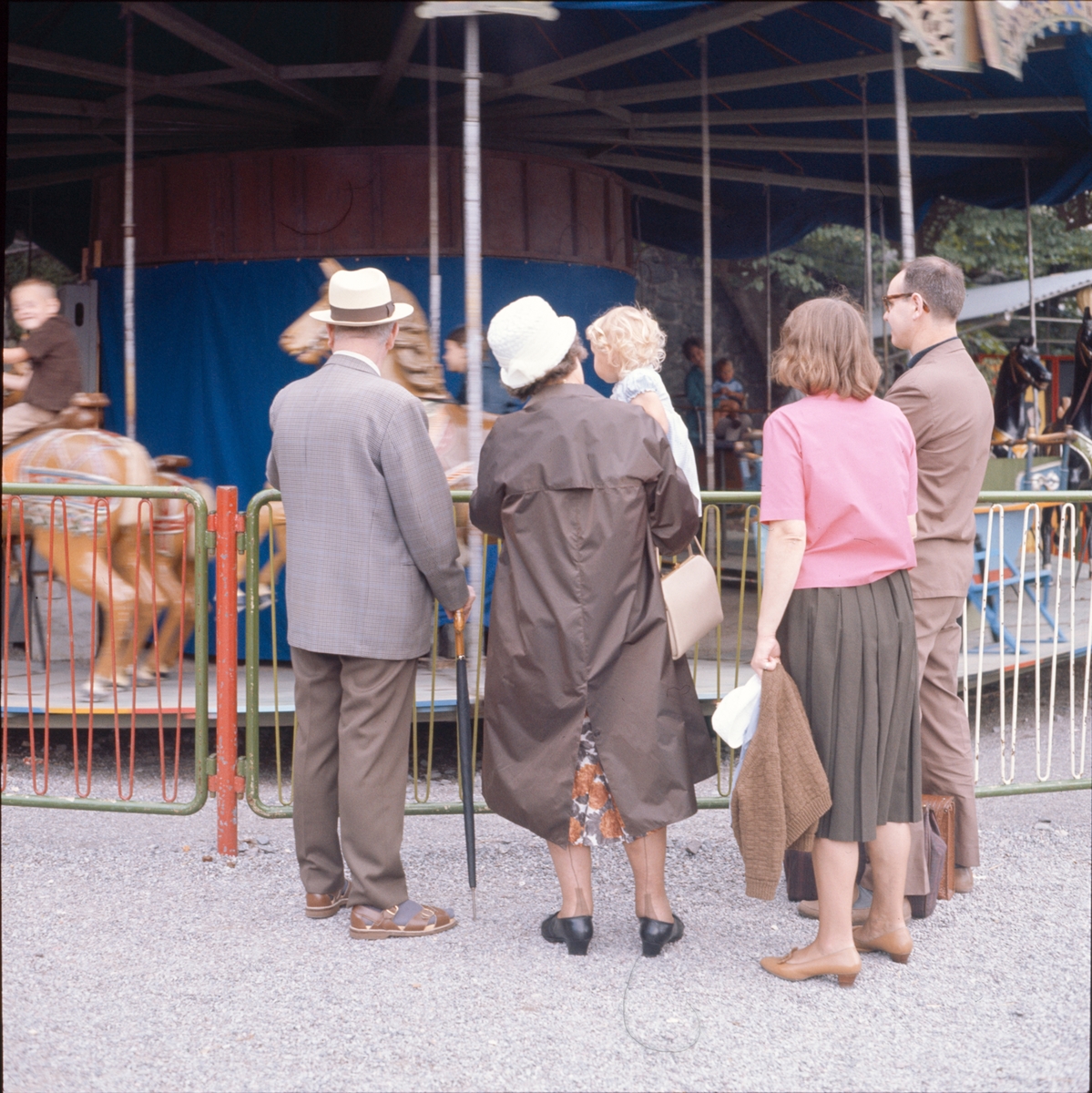 En grupp personer betraktar barn som åker karusell.