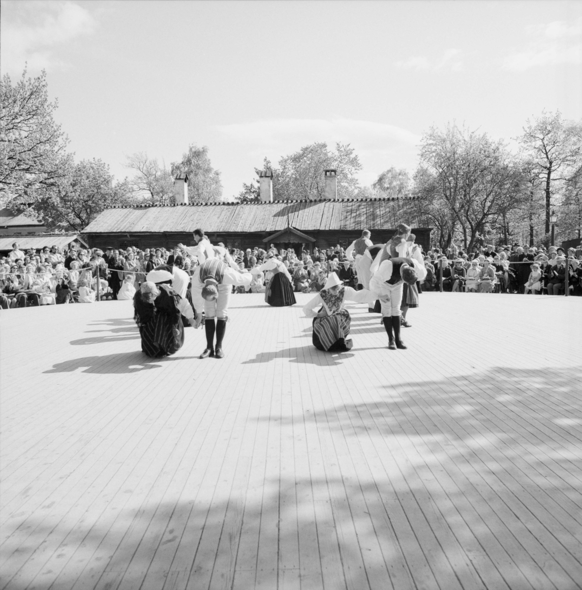Folkdansuppvisning på scen vid Bollnässtugan, Skansen.