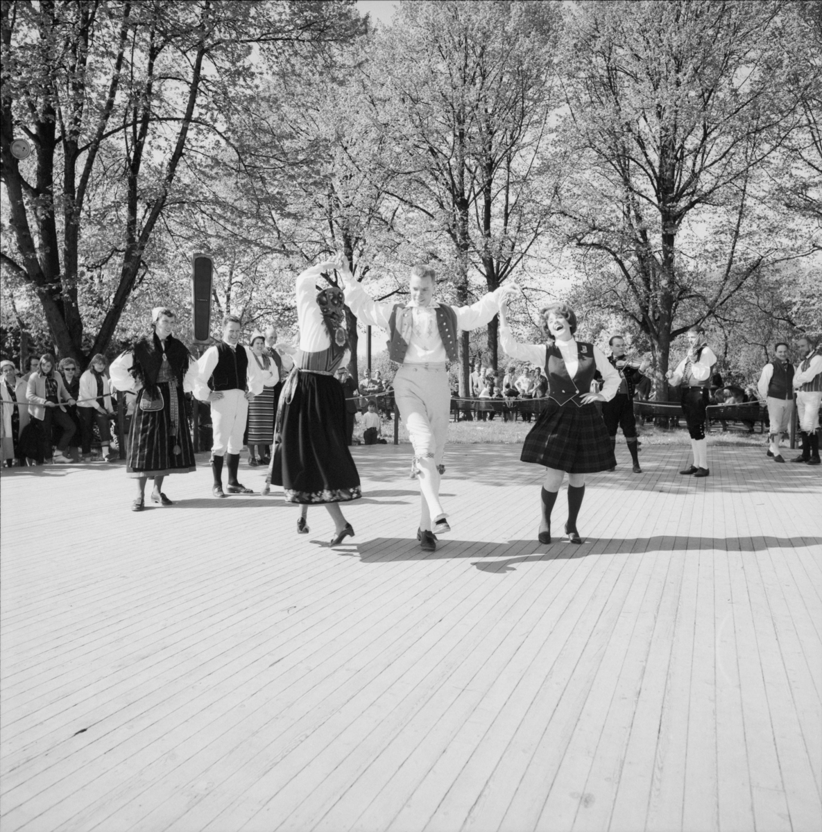 Folkdansuppvisning på scenen vid Bollnästorget, Skansen.