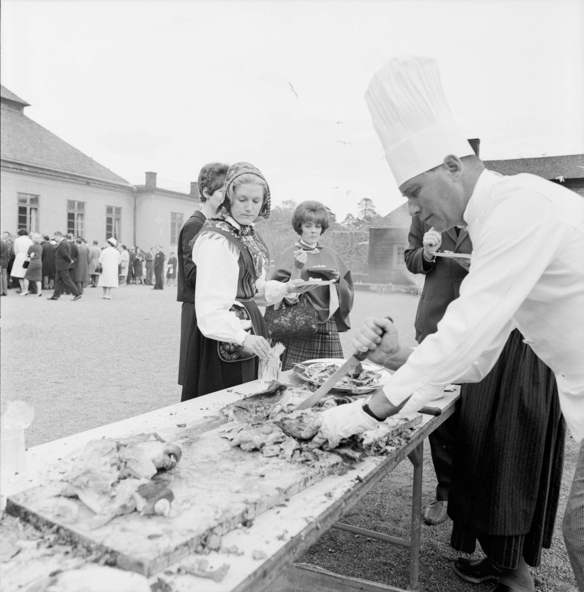Helstekt gris serveras på gårdsplanen utanför Skogaholms herrgård, Skansen.