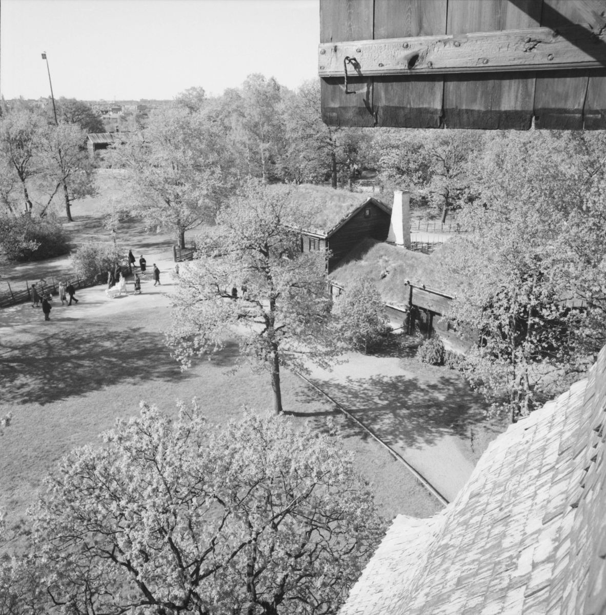 Kyrkhultstugan sedd från Seglora kyrkas torn. Skansen.