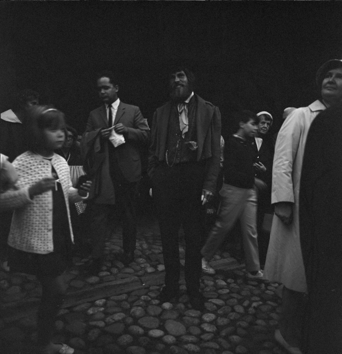 Klädd pedagog bland besökare i Skansens stadskvarter.