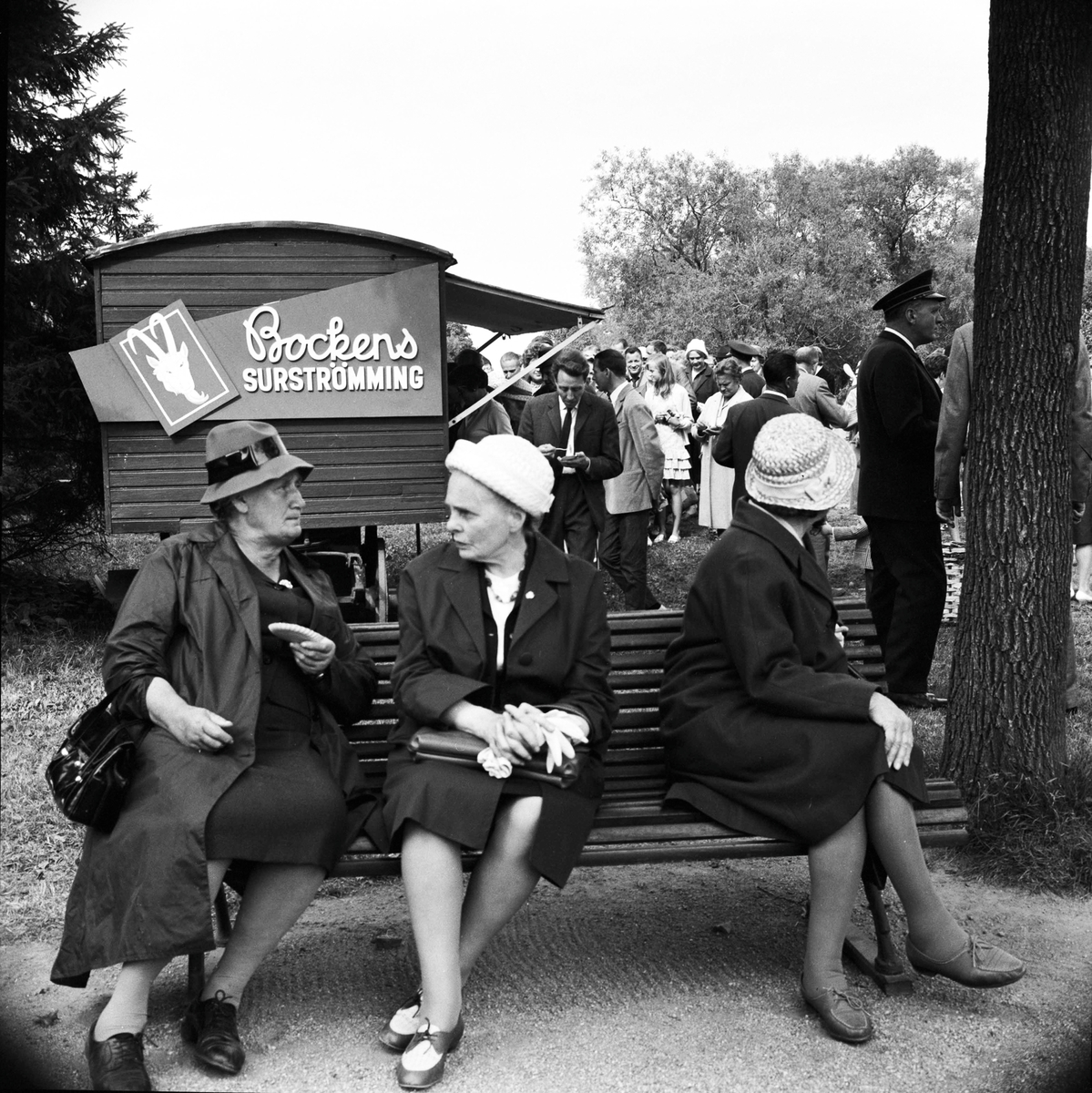 Tre kvinnor på en bänk på Skansen. I bakgrunden marknadsvagn "Bockens surströmming".
