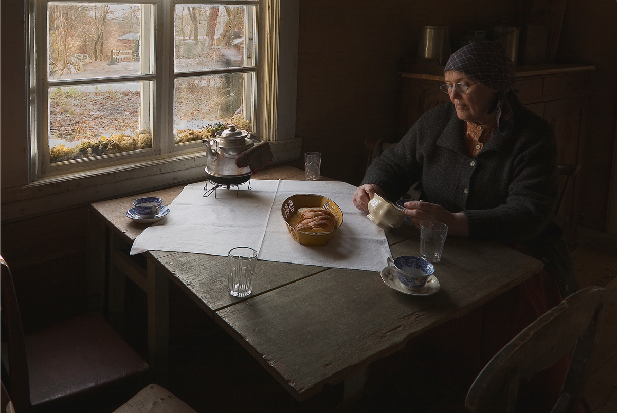 Kulturhistoriskt klädd museipedagog i Statarlängan på Skansen. Dukat bord med kaffekoppar, kaffepanna, brödfat.