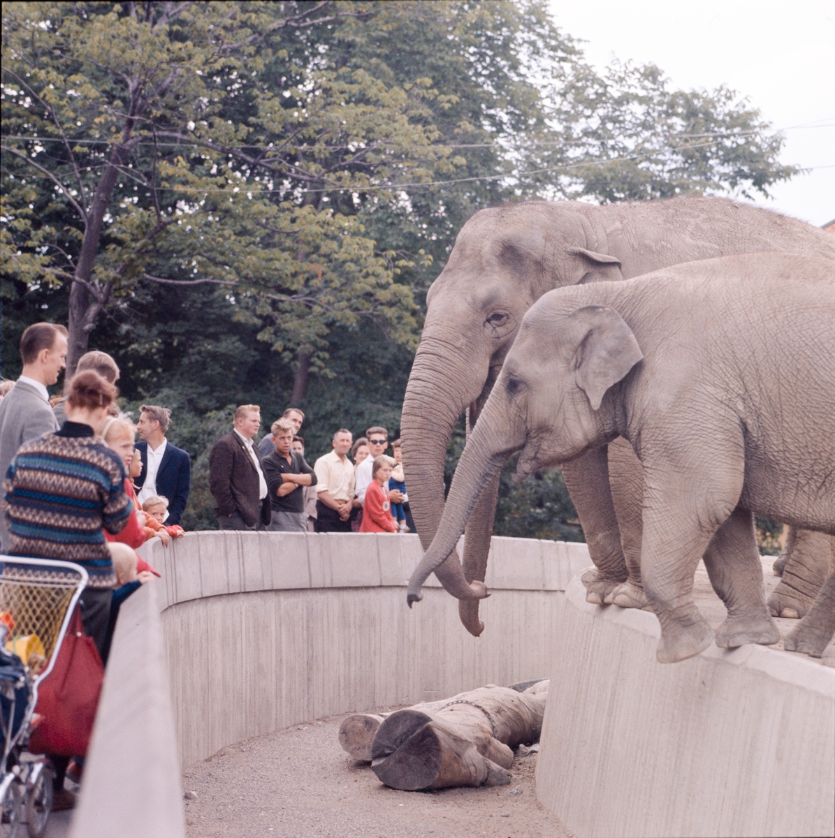 Den unga Asiatiska elefanten Nika i förgrunden vid elefanthuset på Skansen. Barn och vuxna besökare.