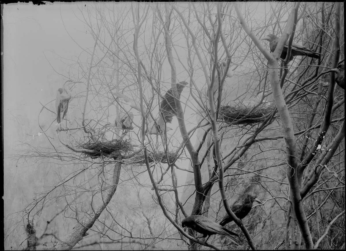 Diorama från Biologiska museets utställning om nordiskt djurliv i havs-, bergs- och skogsmiljö. Fotografi från omkring år 1900.