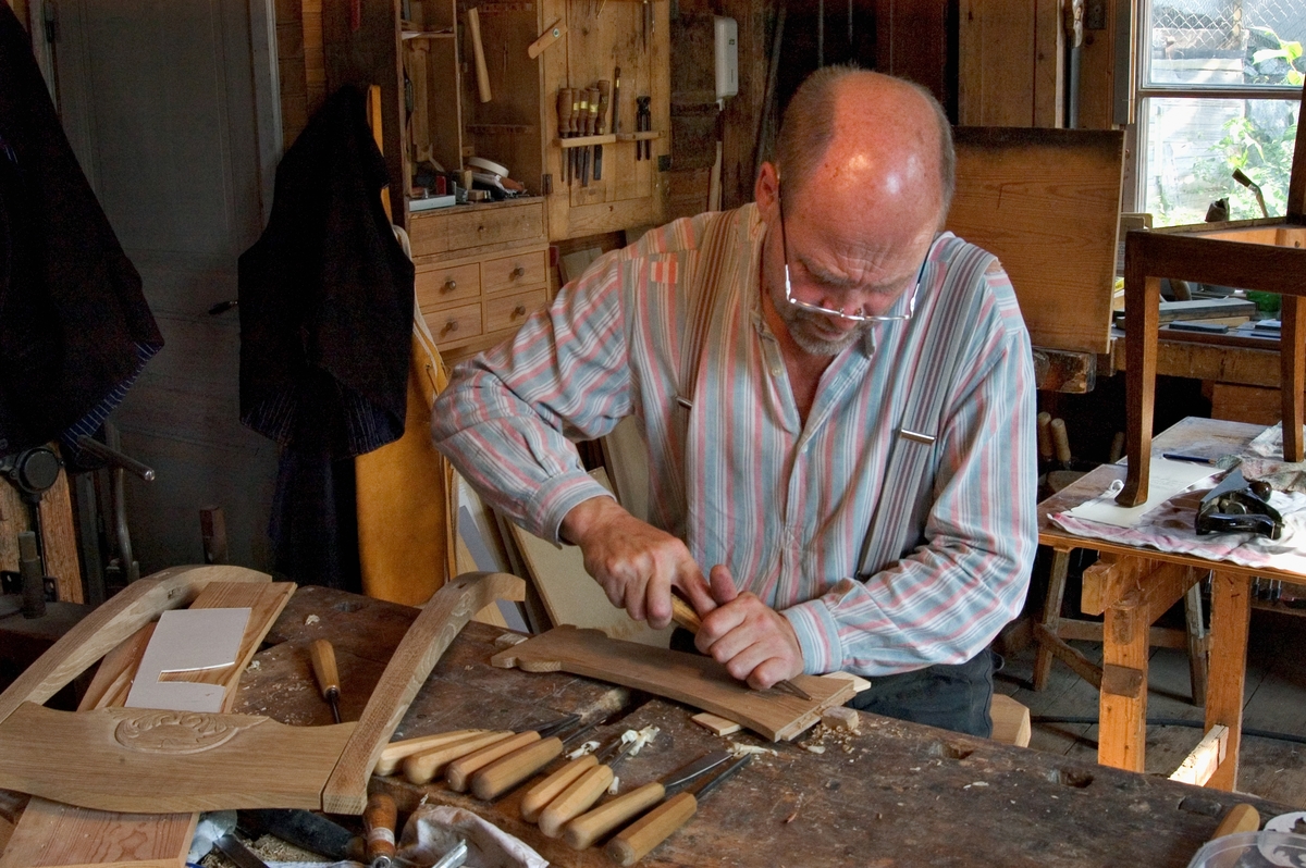 Möbelsnickaren arbetar vid sin snickarbänk.