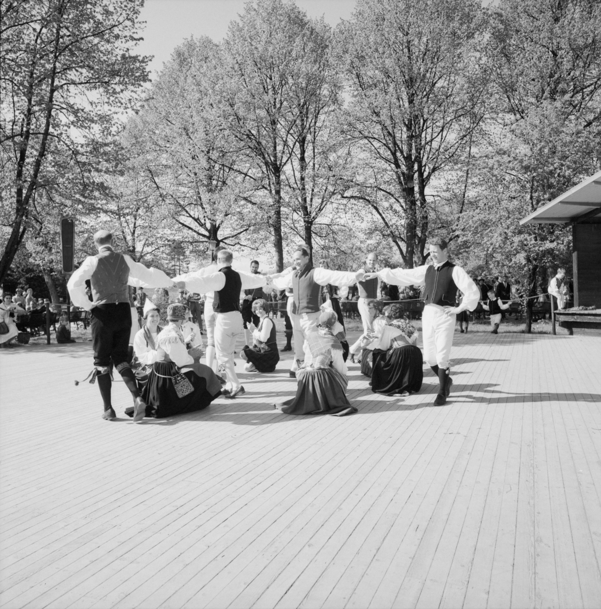Folkdansuppvisning på scenen vid Bollnästorget, Skansen.