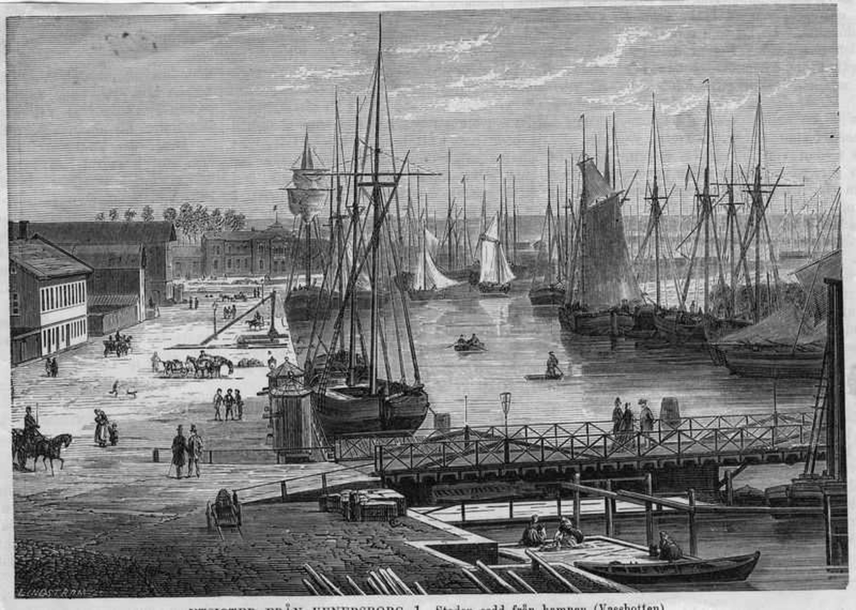 Ur ny illustrerad tidning, staden Vänersborg sedd från hamnen (Vassbotten)