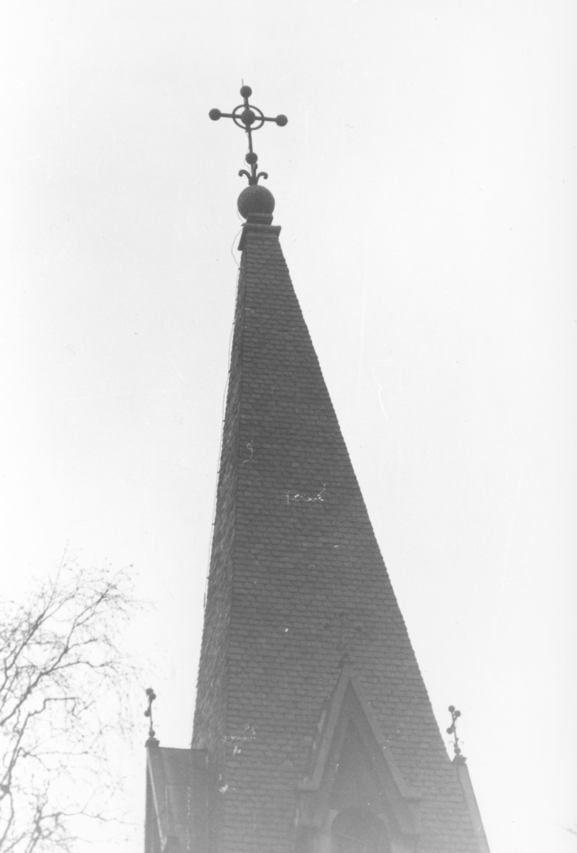 Trollhättan, Gärdhems kyrka, Del av kyrktorn med kors på toppen.