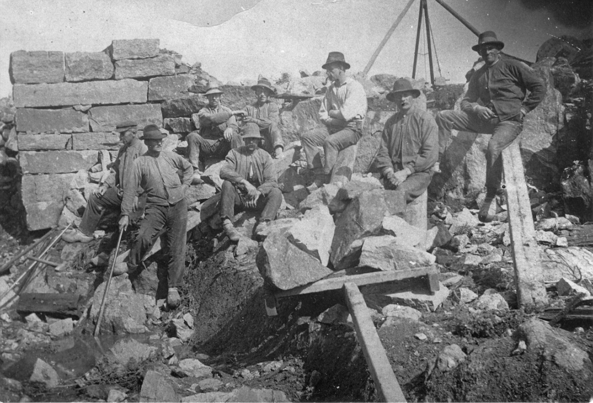 Byggarbetet med Ljurs kvarn. Ett antal män i arbetskläder.