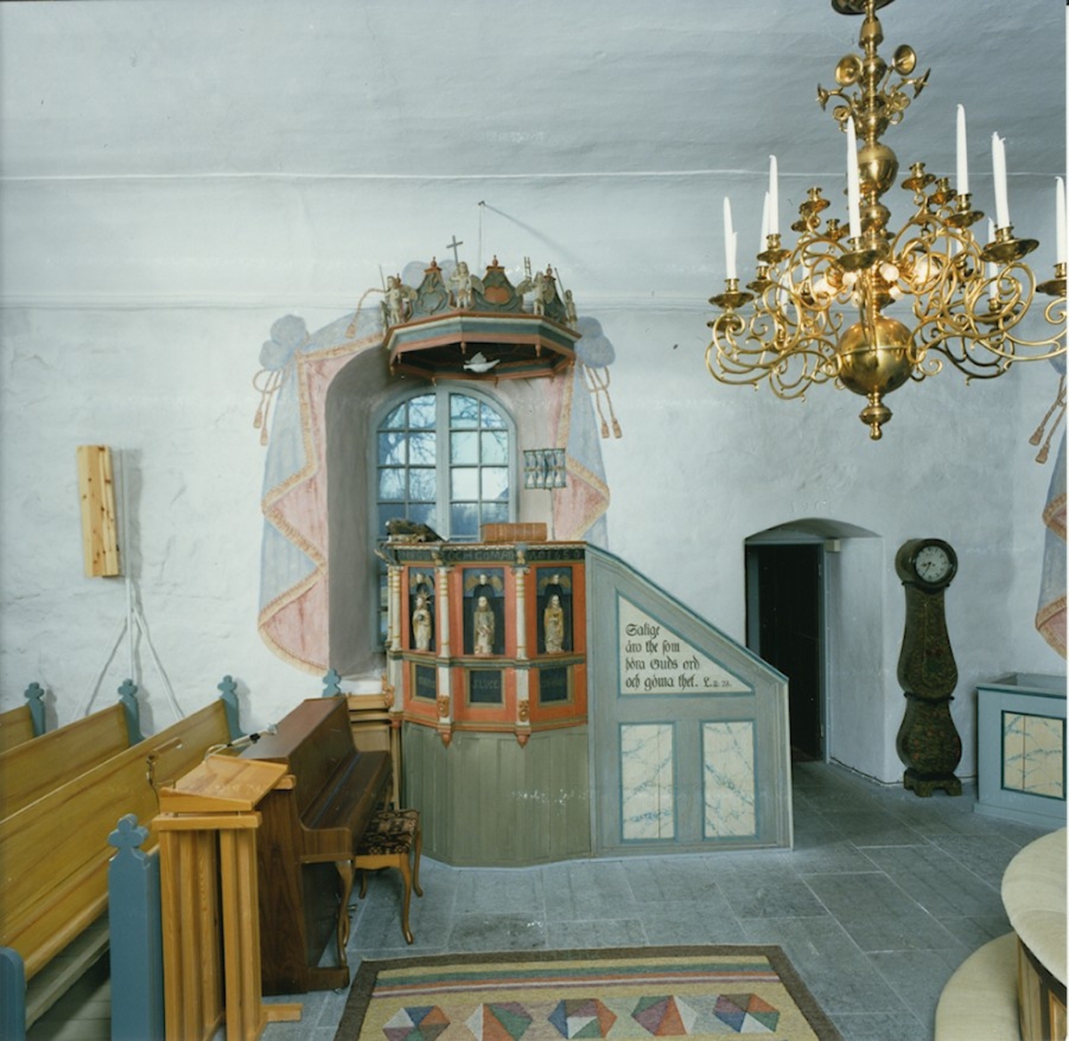 Magra kyrka. Predikstol, fönsterdekoration, golvur, takkrona.