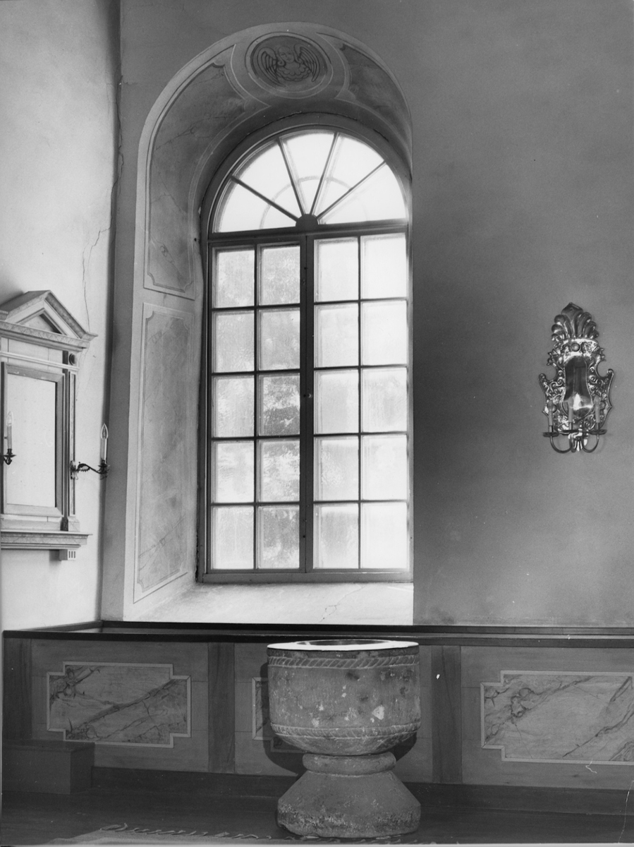 Interiör. Dopfunt. Kyrkfönster. Kullings-Skövde kyrka