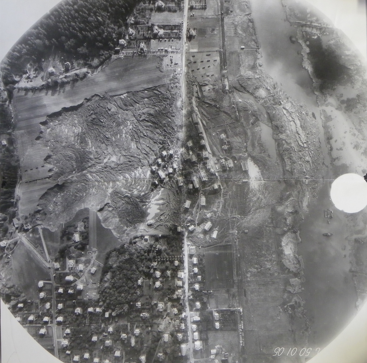 Karteringsfotografi från luften, flygfotografi, över rasområdet i Surte. Raset inträffade 29 september 1950, kl 08.10.