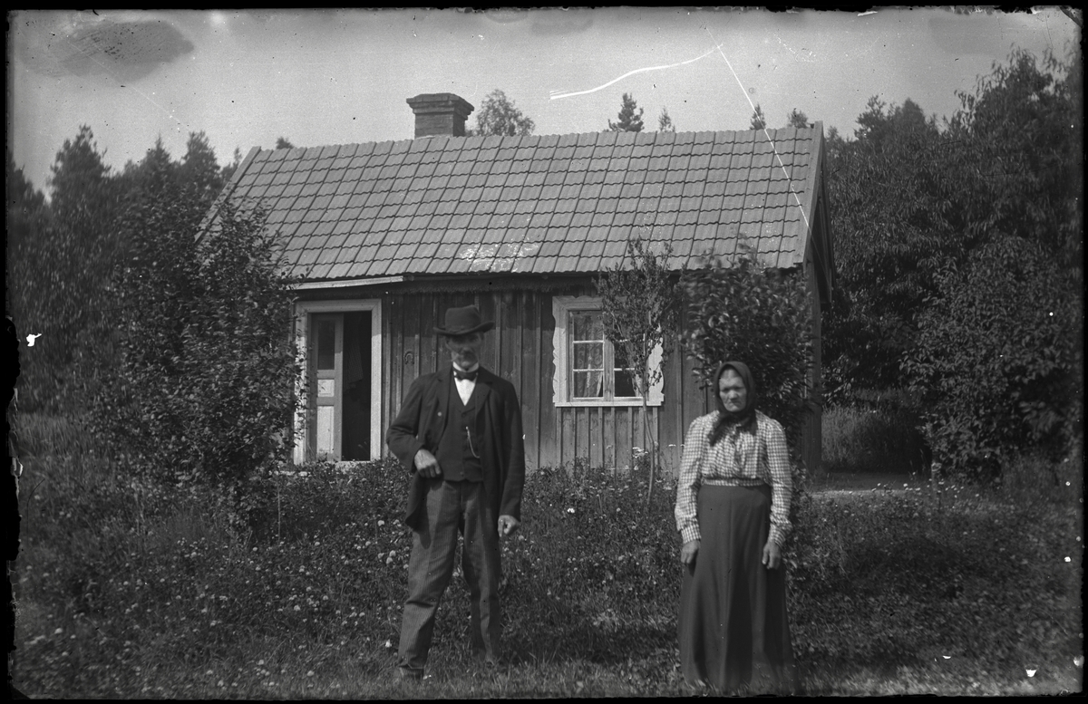Äldre par framför torp